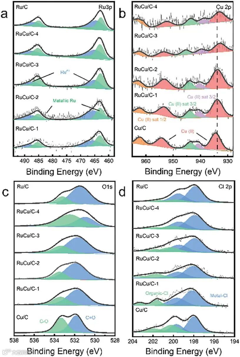 图2. 各样品的高分辨XPS图谱 (a)Ru 3p,(b)Cu 2p,(c)O 1s, (d)Cl 2p图2a的Ru 3p图谱展示,样品系列可以分为两个双峰。
