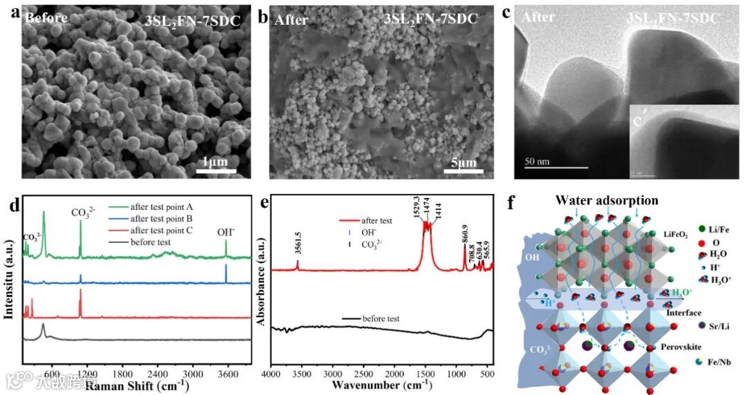 图6. 长时间运行后3SL2FN-7SDC的物理化学性质:(a-c)3SL2FN-7SDC样品的电子显微镜图像,(d,e)拉曼和红外光谱以及(f)通过原位形成的3SL2FN-7SDC/碳酸盐-氢氧化物纳米复合物可能的离子(质子)传导的示意图。