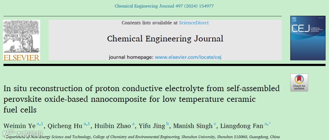 Ye W.#, Hu Q.#, Zhao H., Jing Y., Singh M., Fan L.*, In situ reconstruction of proton conductive electrolyte from self-assembled perovskite oxide-based nanocomposite for low temperature ceramic fuel cells, 497 (2024) 154977.