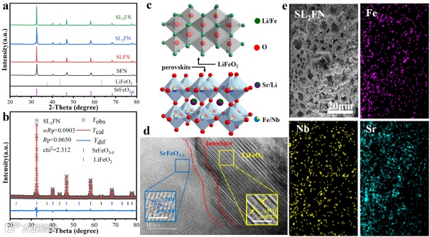 图2. 材料的物相和结构:(a)XRD图谱,(b)Rietveld精修结果,(c)物相结构示意图,(d)SL2FN材料的HR-TEM图像,(e)SL2FN的SEM和EDX图像。