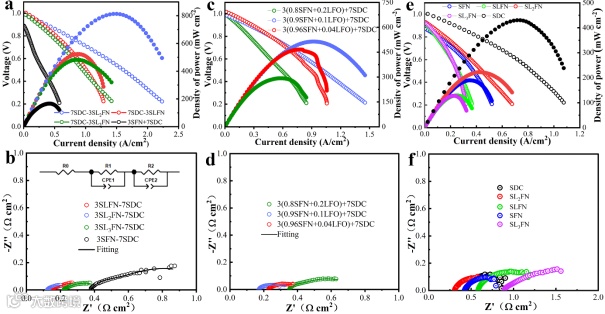 图4. 基于自组装电解质材料的SOFCs电化学性能(特征I-V曲线和EIS,550 °C):(a、b)自组装的3SLxFN-7SDC,(c、d)机械混合的3(1-xSFN-xLFO)-7SDC,(x= 0、0.04、0.1、0.2)和(e、f)单独的SLxFN和SDC