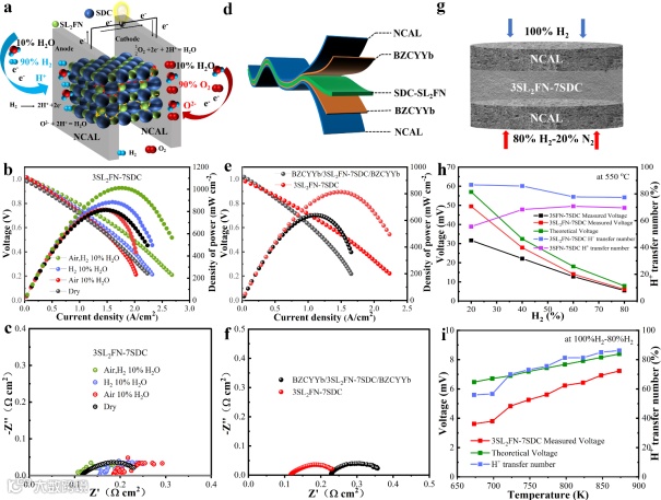 实验发现,当分别向氢电极、空气电极或同时向两侧电极中添加10%水蒸气时,单电池的电解质离子导电率、电极极化面阻以及峰值功率密度均比未加湿单电池有所提高(图5a-c)。加湿引导质子导电性增加、以及具有三重导电特性的锂化的过渡金属氧化物电极提高催化活性协同降低电极极化阻抗和离子传输阻抗。构筑的氧化物/氧化物-碳酸盐/氢氧化物的纳米复合电解质具有优异的质子导电性能。此外,构建的阻塞氧离子导电、构型为NCAL/BZCYYb/3SL2FN-7SDC/BZCYYb/NCAL (图5d)的陶瓷燃料电池在相同的操作条件下获得了638mW/cm2的最大功率输出,约为无BZCYYb层单电池的78.5 %,再次证实高质子传导特性(图5d-f)。进一步构建氢浓差电池(HCC)证实在相同的操作条件下,采用3SL2FN-7SDC半导体复合材料的单电池比采用3SFN-7SDC的单电池表现出更高的电压差,前者质子迁移数(NH+)在测试范围内达到0.8左右(图5g-i)。上述结果表明在给定气氛下的纳米复合层中质子传导主导了整个离子传输过程。