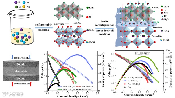 近日,深圳大学的范梁栋研究员课题组,在国际知名期刊Chemical Engineering Journal上发表题为“In situ reconstruction of proton conductive electrolyte from self-assembled perovskite oxide-based nanocomposite for low temperature ceramic fuel cells”的文章。该文章通过锂掺杂诱导的自组装方法开发了一种新型的SLxFN钙钛矿半导体双相材料,并将其作为低温下操作的SOFC的电解质关键成分。这种材料通过自组装形成了具有出色水合能力的LiFeO2新相,并且在燃料电池条件下原位重构成氧化物/氧化物-碳酸盐/氢氧化物纳米复合材料,显著提高了质子传导性。