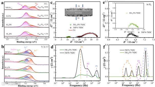 图3. SLxFN样品的XPS谱图:3SFN-7SDC和3SL2FN-7SDC电解质膜在550 °C空气和氢气气氛中的(a)O 1s,(b)Fe 2p和(c-f)EIS和相应的DRT曲线。