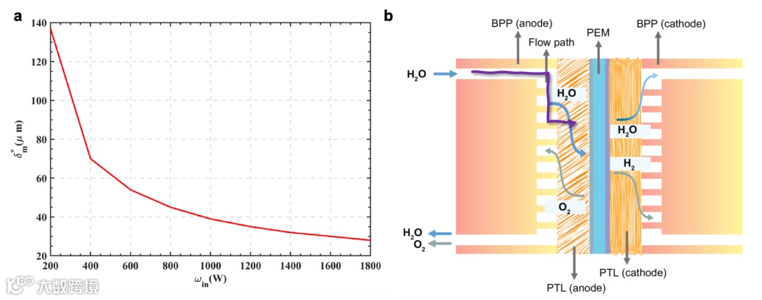 图4. 优化PEM厚度和传质过程以提升性能并降低成本。(a) 不同输入功率下计算得到的PEMWE最佳膜厚度;(b) PEMWE单元结构及紫色箭头所指示的传质路径,突出流道和多孔传输层(PTL)的影响。
