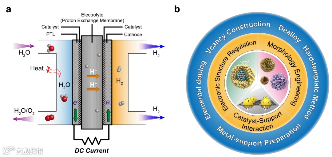 图2. (a) PEM电解槽的工作原理;(b) 铱基氧析出反应催化剂的主要调控策略。