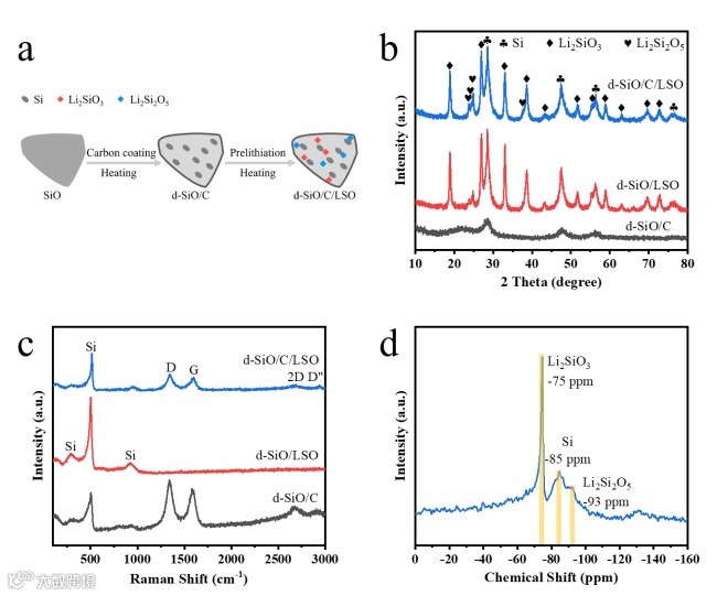 图1(a)d-SiO/C/LSO的制备过程示意图。d-SiO/C,d-SiO/LSO和d-SiO/C/LSO的(b)XRD谱和(c)拉曼光谱。(d)d-SiO/C/LSO的29Si NMR谱。