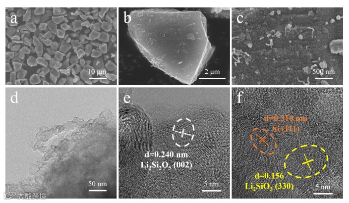 图3(a–c)d-SiO/C/LSO在不同放大倍数下的SEM图像。(d)d-SiO/C/LSO的TEM图像和(e, f)HR-TEM图像。