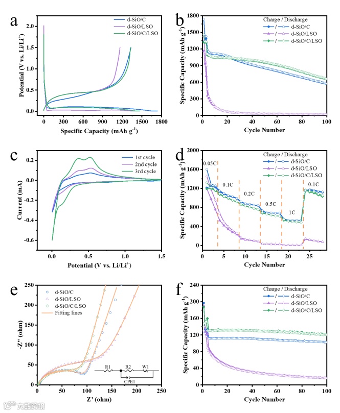 图4 d-SiO/C,d-SiO/LSO和d-SiO/C/LSO的(a)首次放电/充电曲线和(b)循环性能。(c)d-SiO/C/LSO的CV曲线。d-SiO/C,d-SiO/LSO和d-SiO/C/LSO的(d)倍率性能和(e)Nyquist曲线(插图:EIS拟合的等效电路)。(f)NMC811||d-SiO/C,NMC811||d-SiO/LSO和NMC811||d-SiO/C/LSO全电池的循环性能。