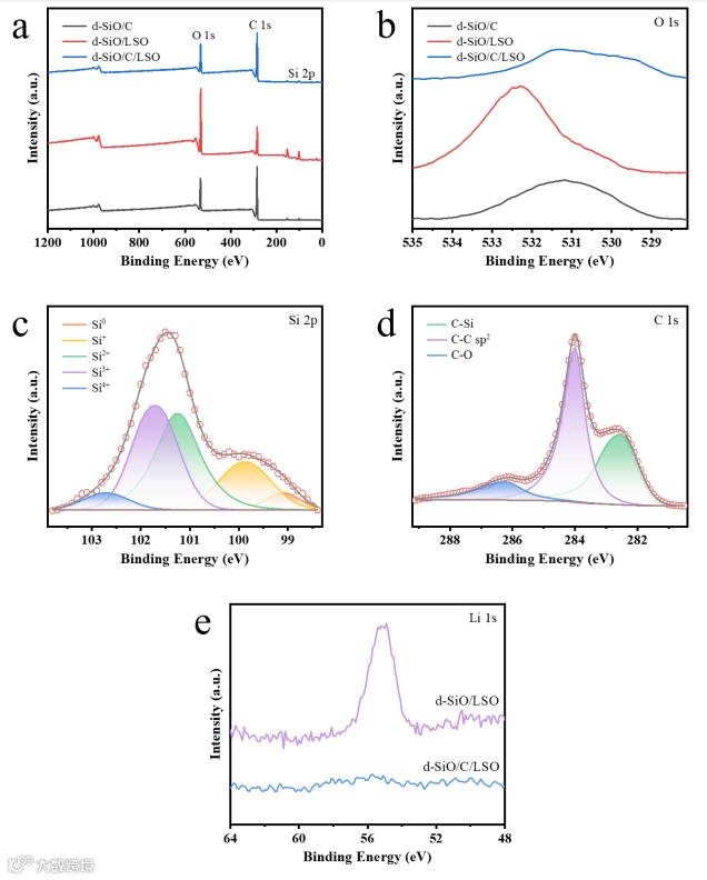 图2 d-SiO/C,d-SiO/LSO和d-SiO/C/LSO的(a)XPS全谱和(b)O 1s XPS谱。d-SiO/C/LSO的(c)Si 2p XPS谱和(d)C 1s XPS谱。(e)d-SiO/LSO,d-SiO/C/LSO的Li 1s XPS谱。