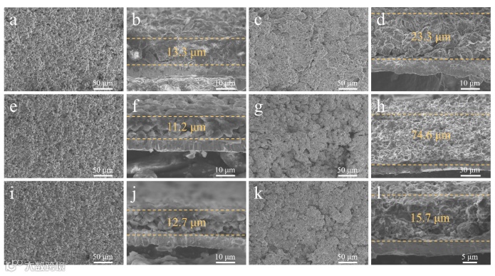 图5(a)d-SiO/C,(e)d-SiO/LSO,(i)d-SiO/C/LSO电极循环前的表面SEM图像。(b)d-SiO/C,(f)d-SiO/LSO,(j)d-SiO/C/LSO电极循环前的截面SEM图像。(c)d-SiO/C,(g)d-SiO/LSO,(k)d-SiO/C/LSO电极循环100次后的表面SEM图像。(d)d-SiO/C,(h)d-SiO/LSO,(l)d-SiO/C/LSO电极循环100次后的截面SEM图像。