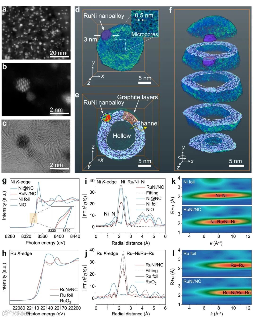 图1. 定制合成的RuNi/NC催化剂的球差电镜图及其三维电子断层扫描重构。