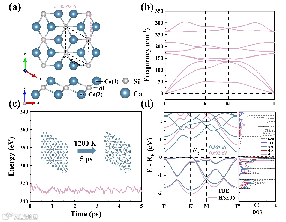 如图一所示,通过CALYPSO 2D全局最小值搜索得到了Ca2Si单层是具有最低能量以及0.369 eV间接带隙的三明治六方半导体结构,且优化后的晶格常数为a = b = 4.694 Å。同时,通过声子谱计算和分子动力学模拟,发现其在整个布里渊区内未观察到显著的虚频。在300至1200 K的温度范围内,保持了基本结构特征,表明其具有优良的晶格动态稳定性和热稳定性。