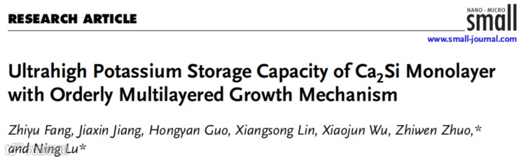 基于此,来自安徽师范大学的卢宁副教授和中国科学技术大学的卓之问副研究员在知名期刊Small上发表题为“Ultrahigh Potassium Storage Capacity of Ca2Si Monolayer with Orderly Multilayered Growth Mechanism”的研究论文。本文介绍了一种具有有序多层生长(OMLG)机制的二维Ca2Si单层材料,利用第一性原理计算,理论上展示了其在钾储存中的潜力。