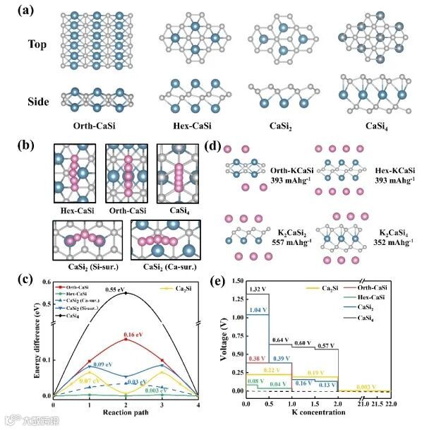 为了研究其他Ca-Si化合物的储钾性能,选择了具有明显层状结构的热力学稳定的3D-CaSi和3D-CaSi2。通过直接剥离得到四种二维Ca-Si化合物单层:Orth-CaSi单层膜(来源于3D-CaSi),CaSi2、Hex-CaSi和CaSi4单层膜(均来源于3D-CaSi2)。K离子在Hex-CaSi上的迁移势垒最低(0.003 eV),在CaSi4上最高(0.55 eV)。比容量计算显示,这些二维Ca-Si体系只能吸附单层钾,饱和吸附体系分别为Orth-KCaSi、Hex-KCaSi、K2CaSi2和K2CaSi4,对应的理论比容量(CM,max)为352至557 mAh g−1。除Hex-KCaSi外,其他系统具有更高的初始电压平台和更明显的电压下降。相比之下,Ca2Si单层具有低迁移势垒(0.07 eV)、稳定的开路电压(0.003-0.240 V)和显著更高的比容量(5459 mAh g−1),是最有前途的钾基电池负极材料。