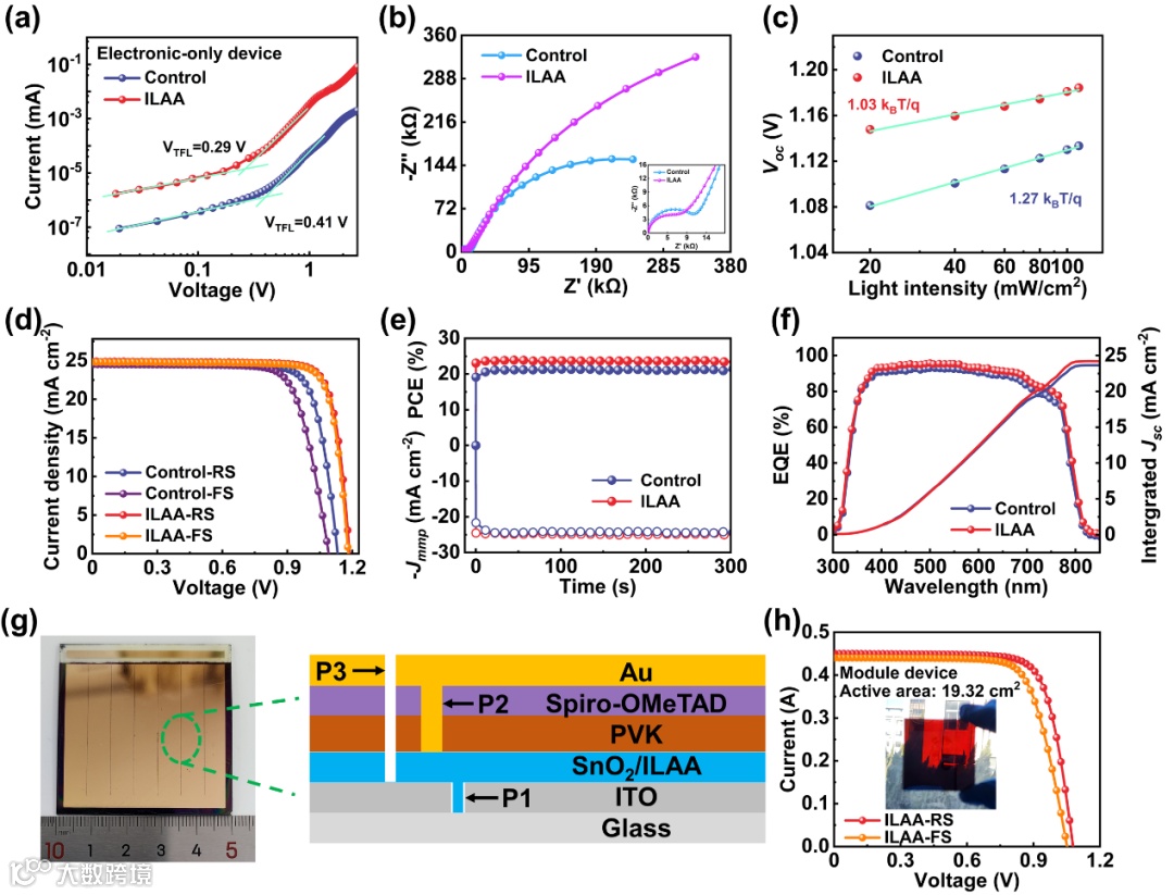 通过一系列电学表征测试,本研究证明了ILAA修饰后的器件性能显著提升。改良后的冠军器件光电转换效率达到了24.04%。值得注意的是,与过去三年中发表的底部界面改性研究相比,此项工作实现了最高之一的开路电压(VOC),达到了1.19 V。此外,还成功制备了5×5 cm²的并联模组,其冠军效率达到了19.10%。这一成果为钙钛矿太阳能电池的商业化应用提供了重要的借鉴意义。