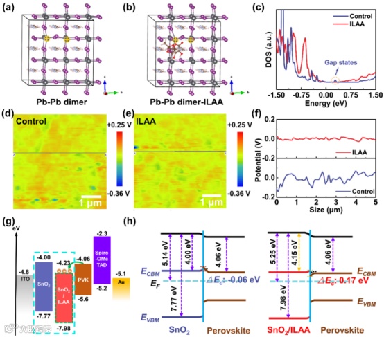 通过DFT计算证明,ILAA能够破坏Pb-Pb二聚体结构,并消除带隙中的间隙态,而DMSO的态密度结果则显示其并未能消除间隙态。这表明ILAA与钙钛矿之间的相互作用强于DMSO,从而显著提升了钙钛矿埋层底面薄膜的质量。此外,KPFM结果进一步验证了ILAA的钝化效果,而UPS结果则表明,ILAA的修饰使得SnO2与钙钛矿之间的能级更加匹配,有效提升了电荷传输质量。