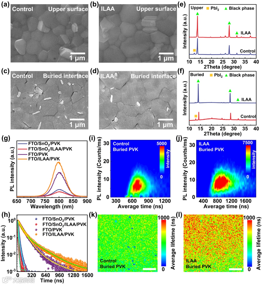 通过无损剥离技术,研究发现ILAA不仅能够有效减少钙钛矿埋底界面中的间隙,还显著提升了薄膜的结晶质量。此外,一系列光学表征结果进一步证明,ILAA在钝化钙钛矿薄膜内部缺陷的同时,也大幅提高了载流子的迁移速率。这些发现为提升钙钛矿太阳能电池的整体性能提供了引导性支持与新的思路。