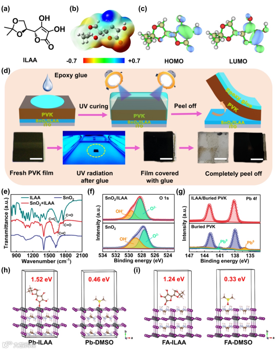 首先,研究团队采用完整剥离技术,对钙钛矿薄膜进行剥离,暴露出埋底界面,以便对其进行深入研究。通过各项表征技术,证实了修饰分子ILAA与钙钛矿之间存在显著的相互作用,能够有效促进SnO2薄膜中氧空位向晶格氧的转化,并减少Pb0的生成,从而减轻传输过程中的非辐射载流子复合。此外,研究还通过DFT计算深入探讨了 ILAA 的自身性质,并重点分析了ILAA与钙钛矿分子PbI2封端表面和FAI封端表面的相互作用力。通过与DMSO相比较,结果显示ILAA通过螯合作用与钙钛矿分子形成了更紧密的相互作用。