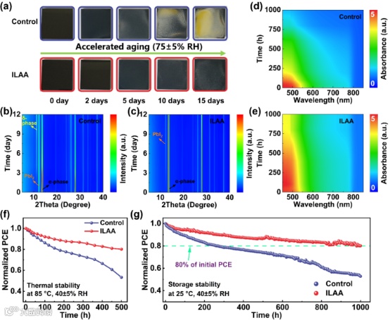 在钙钛矿薄膜的稳定性方面,无论是在常规空气环境还是高湿度加速老化环境中,ILAA修饰后的薄膜均表现出显著的稳定性优势。在器件稳定性测试中,经过ILAA修饰的器件在40±5%相对湿度的空气环境下,1000小时后仍能保持初始效率的80.1%,在500小时的高温条件下则保留了80.2%的初始效率。此外,在氮气手套箱中进行的最大功率点运行稳定性测试中,经过360小时后,器件仍保留了初始效率的82.90%。这些结果均优于未经过ILAA修饰的对照器件,充分验证了ILAA在构建坚固埋地界面方面的有效性。