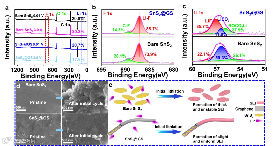 图 6. SnS2@GS和纯SnS2(a)XPS 光谱以及相应的高分辨率光谱(b)F 1s 和(c)Li 1s ;(d)SnS2@GS和纯SnS2在初始循环阶段电极表面的SEM图像;(e) 初始循环中不同SEI层形成模型的示意图。