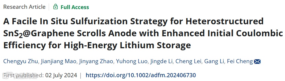 近日,来自河北工业大学的程菲教授,在国际知名期刊Advanced Functional Materials上发表题为“A Facile In Situ Sulfurization Strategy for Heterostructured SnS2@Graphene Scrolls Anode with Enhanced Initial Coulombic Efficiency for High-Energy Lithium Storage”的文章。在该工作中,通过简单的原位硫化策略设计合成了原位锚定在石墨烯纳米卷(GS)上的SnS2异质结构杂化材料(SnS2@GS)。与生长在平面石墨烯上的SnS2杂化材料相比,这种SnS2@GS杂化材料具有开放的一维结构,从而为离子扩散和电子传输提供了有序和快速的路径。此外,SnS2@GS中丰富的孔结构和空间冗余增加了活性位点,且能够更好地适应锂储存过程中SnS2的体积变化。基于其独特的结构优势,SnS2@GS杂化材料展现出优异的储锂性能,这种独特的结构设计策略为先进储能器件中高性能电极材料的构建提供了有意义的参考。