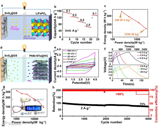 图8. LiFePO4//SnS2@GS全电池(a)示意图,(b)倍率性能和(c)Ragone图;SnS2@GS//PANI-NTs@HG锂离子电容器(d)示意图,(e)CV曲线,(f)GCD曲线,(g)Ragone图(插图:发光LED屏幕(3V)的照片)和(h)在2 A g-1下的长循环性能。