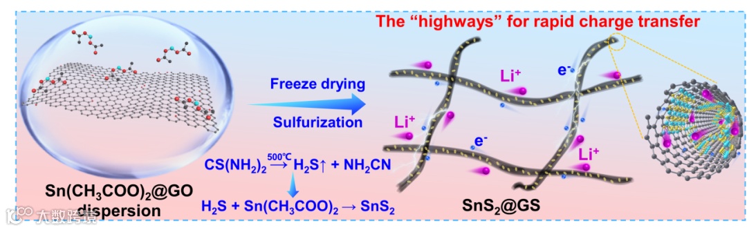 图1. 原位生长在石墨烯卷上的SnS2杂化材料制备流程示意图