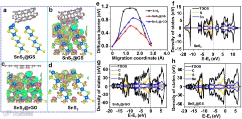 图5.(a)SnS2@GS的优化原子结构;不同样品模型的(b-d)相应的电荷差分密度,(e)Li迁移能量曲线和(f-g)能带结构