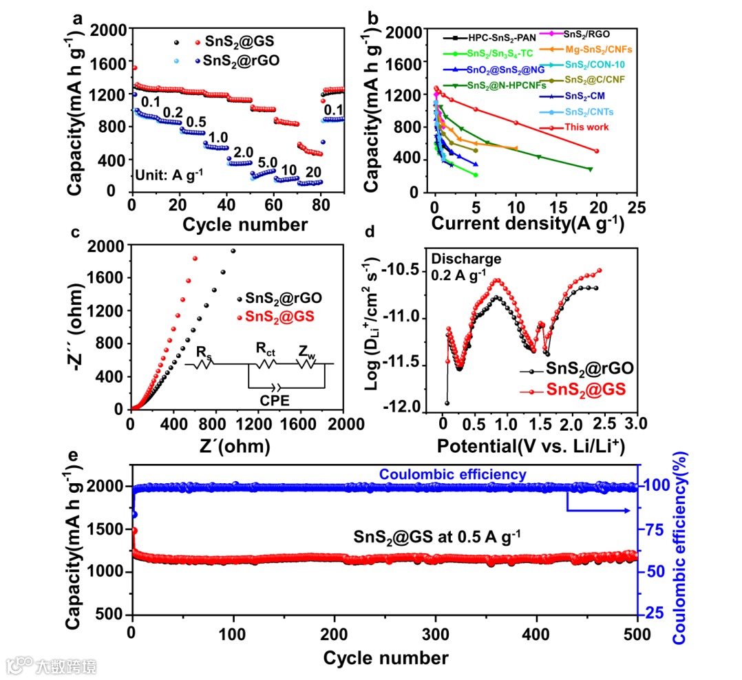 图4.(a)SnS2@GS和SnS2@rGO的倍率性能;(b)SnS2@GS的倍率性能与先前研究中SnS2基阳极材料的比较;(c)SnS2@GS和SnS2@rGO的能奎斯特曲线;(d)SnS2@GS和SnS2@rGO的Li+扩散系数曲线;(e)SnS2@GS的长循环性能曲线。