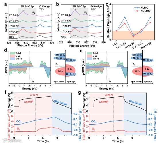 图6 NLMO和NCLMO的阴离子氧化还原可逆性。(a) NLMO和(b) NCLMO第一次循环的非原位O K-edge XAS光谱。(c) NLMO和NCLMO的前缘峰区域面积积分值的变化。(d) NLMO和(e) NCLMO在深度脱钠态下的pDOS。(f) NLMO和(g) NCLMO在0.1 C下首次循环中的原位DEMS数据。