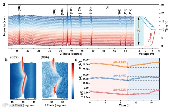 非活性Ca离子在Na层中的牢固锚定使得NCLMO在首次循环过程中并未发生相变,保持良好P2相结构,表现出几乎为零的应变特征(晶格参数c和晶胞体积V的最大变化分别为2.45%和3.74%)。