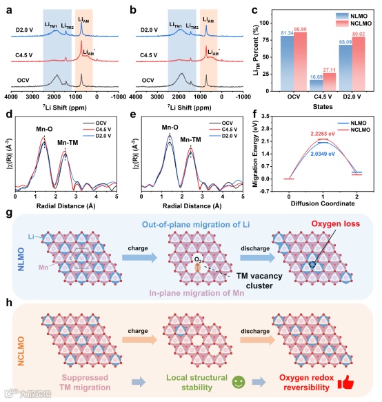 图5 NLMO与NCLMO的局部环境演化。(a) NLMO和(b) NCLMO在OCV、C4.5 V和D2.0 V状态下的7Li ssNMR谱。(c) NLMO和NCLMO对应的LiTM比例。(d) NLMO和(e) NCLMO在不同状态下的Mn K-edge FT-EXAFS谱。(f) 在C4.5 V状态下Mn在NLMO和NCLMO中的面内迁移能。(g) NLMO和(h) NCLMO在首次充放电过程中的局部结构演变示意图。