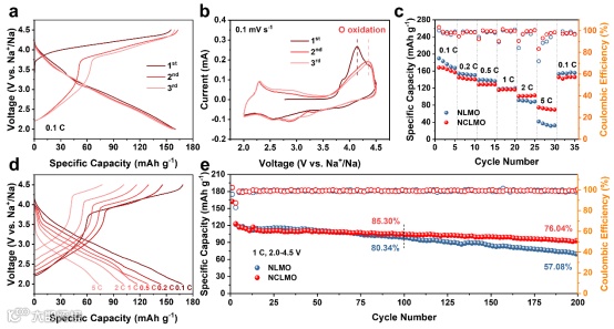 图3 NLMO和NCLMO的电化学性能。(a) 2.0–4.5 V范围内,NCLMO在20 mA g-1时前3次循环的恒流充放电曲线。(b) 0.1 mV s-1条件下NCLMO前3次循环的CV曲线。(c) NLMO和NCLMO的倍率性能。(d) NCLMO在不同电流下的充放电曲线。(e) 200 mA g-1时NLMO和NCLMO的循环性能。
