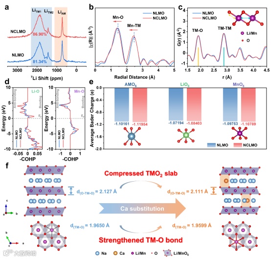 图2 NLMO和NCLMO的局部环境。(a) NLMO和NCLMO在开路电压(OCV)状态下的7Li ssNMR谱和(b) Mn K-edge FT-EXAFS谱。(c) OCV状态下NLMO和NCLMO的x射线PDF数据。(d) NLMO和NCLMO中Li–O和Mn–O键的COHP。(e) NLMO和NCLMO的AMO6三棱柱和TMO6八面体中O原子的平均Bader电荷。(f) Ca取代后晶格结构变化示意图。