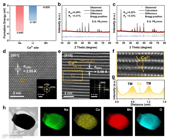 通过DFT计算分析了Ca2+更倾向于占据Na位点,并通过XRD结构精修和HAADF-STEM确认了Ca在Na层的成功引入和NCLMO的P2型结构,且元素均匀分布。