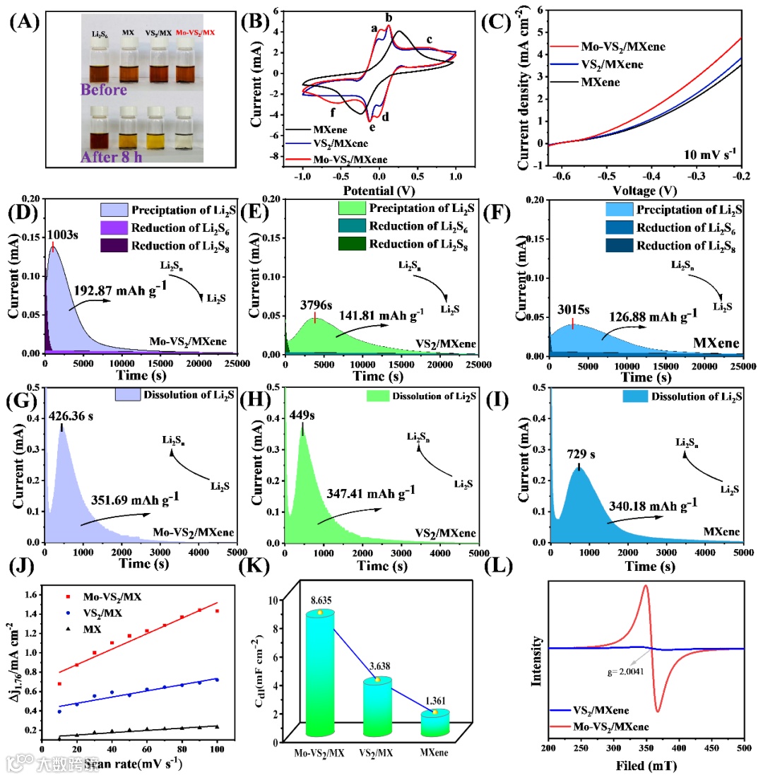 通过静态吸附实验表明与MXene和VS2相比,Mo-VS2/MXene对LiPSs具有更强的吸附能力。进一步通过CV曲线,LSV曲线,Li2S的沉积溶解实验等电化学表征,证明Mo原子掺杂与界面内建电场的协同效应显著提高了硫氧化还原反应的动力学。