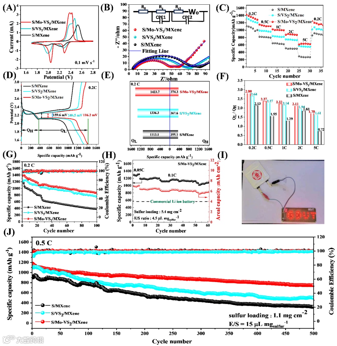 要点三:协同Mo原子掺杂与界面内建电场的Mo-VS2/MXene催化剂的锂硫电池性能