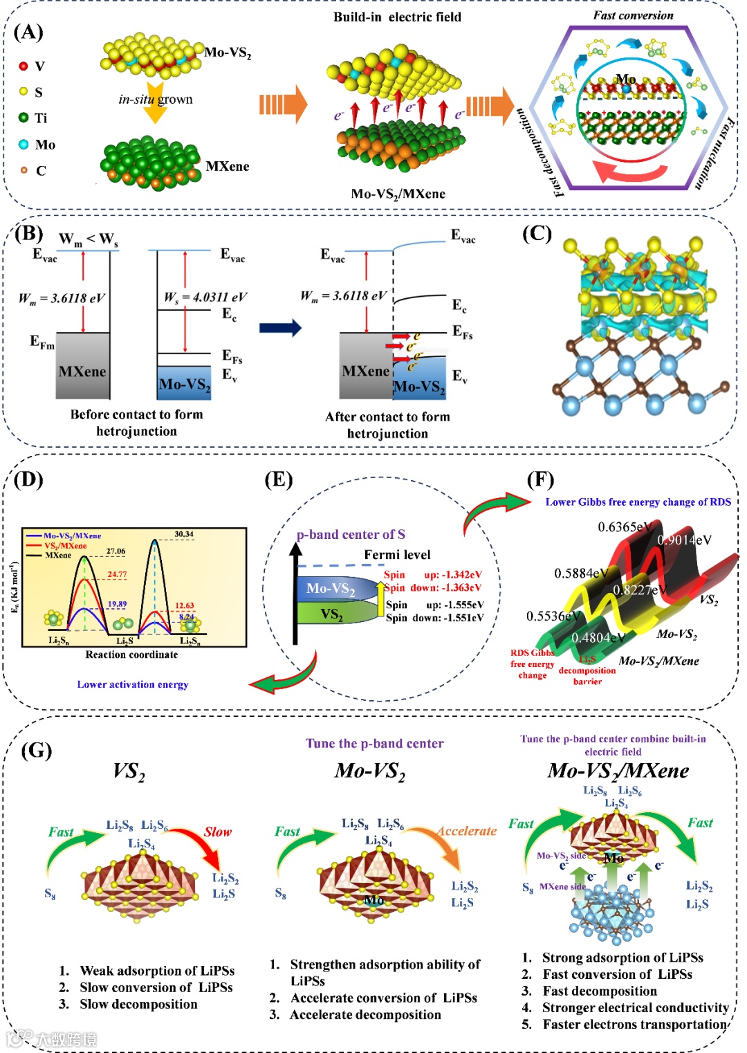 图1 A. Mo-VS2/MXene催化剂的合成过程及内置电场BIEF的形成。B. DFT计算出的MXene、Mo-VS2接触形成异质结构前后的功函数。C. Mo-VS2/MXene的差分电荷密度。D. LiPSs/Li2S在Mo-VS2/MXene、VS2/MXene、MXene上转化的活化能(Ea)。E. 掺杂原子周围硫原子的3p轨道的p带中心。F. Mo-VS2/MXene, Mo-VS2, VS2催化剂Li2S分解的速控步骤的吉布斯自由能变化和Li2S分解能垒。G) LiPSs在不同催化剂表面的转化示意图。