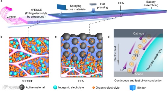 Scheme 1. Schematic diagram of the SSLB fabricating process and key components. (a) The continuous fabrication process of the EEA based on an ePTFE skeleton. (b) The ePTFE filled with ceramic–polymer SCEs (ePESCE). (c) An integrated active material/ePESCE electrolyte membrane (EEA). (d) Illustration of continuous and fast Li-ion conduction in EEA.