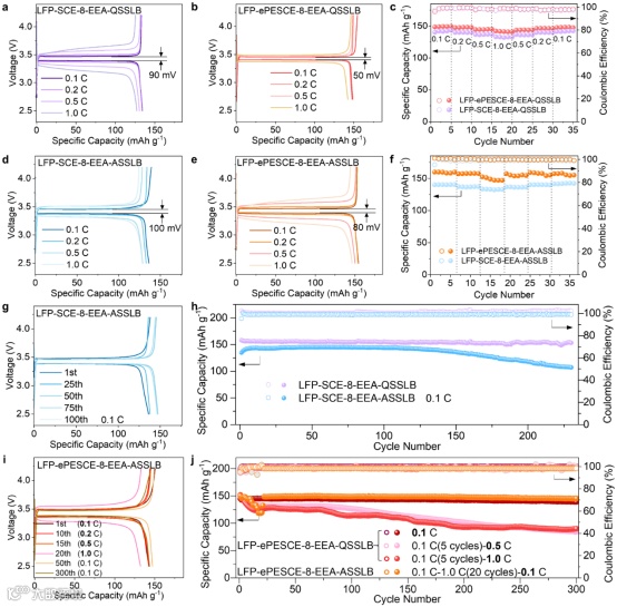 Figure 2. Electrochemical performance of the quasi/all–solid–state lithium metal batteries with EEAs (CR2016 coin cell; 25 ℃). Charge/discharge curves of the (a, b) LFP-SCE-8/ePESCE-8-EEA–based QSSLBs and (d, e) ASSLBs at various C-rates, and (c, f) their corresponding rate performance. (g) Galvanostatic charge/discharge curves of LFP-SCE-8-EEA-ASSLB at different cycles. (h) Comparison of the cycling performance of LFP-SCE-8-EEA-ASSLB and LFP-SCE-8-EEA-QSSLB. (i) Galvanostatic charge/discharge curves of LFP-ePESCE-8-EEA-ASSLB at different cycles. (j) Comparison of the cycling performance of LFP-ePESCE-8-EEA-ASSLB and LFP-ePESCE-8-EEA-QSSLB.