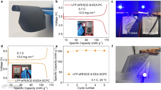 Figure 3. The flexibility, electrochemical performance, and safety tests of the pouch-type SSLBs. (a) The high crimped LFP-ePESCE-8-EEA. (b, d) The charge/discharge curves of LFP-ePESCE-8-EEA-PC and LFP-ePESCE-8-EEA-SCPC (Inset shows the open-circuit voltage of the PC). (c, f) Photographs of the LFP-ePESCE-8-EEA-PC and LFP-ePESCE-8-EEA-SCPC powering an LED light under folded (left) and shearing off (right).