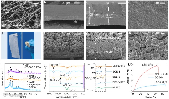 Figure 1. SEM morphological characterization of the ePTFE–related materials. (a) Morphology of ePTFE skeleton. Outline (b), cross–sectional images (c), and top view (d) of the ePTFE–enforced solid–state composite electrolyte (ePESCE-8). (e) Photographs of ePESCE-8. Outline (f), cross–sectional images (g), and top view (h) of the integrated active material (LFP)/ePESCE-8 membrane (ePESCE-8-EEA). (i) XRD patterns of SCE-8, ePESCE-8, and ePESCE-8-EEA. (j) FTIR spectra of PVDF-HFP, ePTFE, SCE-0, SCE-8, and ePESCE-8. (k) Stress–strain curves of SCE-8, and ePESCE-8.