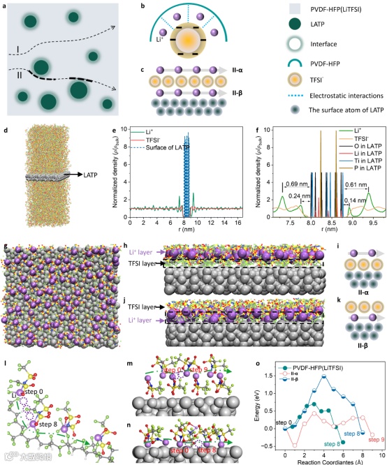 Figure 4. Analysis of the ion transport mechanism of the ePESCE-8 electrolyte. (a) Schematic presentation of two possible Li-ion migration paths in the electrolyte (polymer bulk phase (I) and organic–inorganic electrolyte interface (II)). (b) Illustration of the possible Li-ion pathway in a polymer electrolyte. (c) Diagram of the two possible rapid Li-ion transport pathways at the interface of the composite electrolyte speculated in this manuscript; II-α represents the Li-ion transport pathway in the TFSI- layer closest to the LATP interface and II-β represents the Li-ion migration pathway at the surface of LATP. (d) Snapshots of the MD simulations of the molecular species (Li+ and TFSI-); the grey part indicates LATP slab and the other color codes are as follows: Li+ (purple), oxygen (red), sulfur (yellow), fluorine (green), and nitrogen (blue). (e) Density profiles of SCE with the LATP slab; ρ and ρbulk represent the density and bulk density of the specified species. (f) Density profiles of SCE near the LATP slab. (g) Snapshots of the Li-atom distribution on the TFSI- layer closest to the surface of LATP. (h, i) Snapshots of the Li-ion distribution on the TFSI layer closest to the surface of LATP and the corresponding schematic diagram (II-α). (j, k) Snapshots of the Li-ion distribution at the surface of LATP and the corresponding schematic diagram (II-β). The (l) possible Li-ion transport pathways in PAVDF-HFP, (m) II-α, and (n) II-β from first principles, and the (o) corresponding Li-ion migration energy barrier.