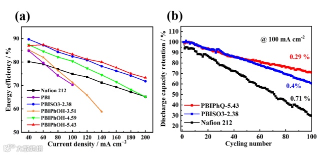 要点三:优于Nafion 212膜的VRFB能量效率和容量保持率。