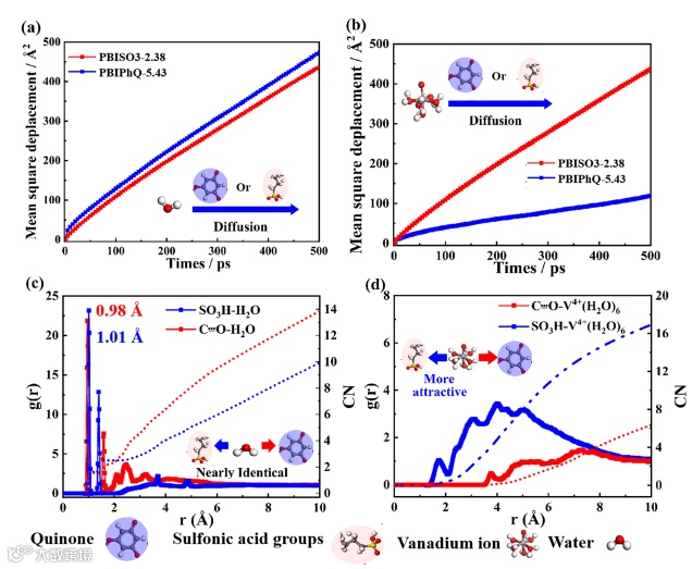 分子动力学模拟(MD)研究表明,与传统的磺酸基PBI膜(PBISO3)相比,醌基PBIPhQ膜表现出不同的水和钒离子扩散行为,极大地影响H+/Vn+的选择性。如图3(a)和(b)所示,对于PBIPhQ-5.43和PBISO3-2.38膜,根据均方位移斜率计算出水的扩散系数几乎相同(分别为1.58×103 cm2 s−1和1.46×103 cm2 s−1),而V4+离子扩散系数在PBIPhQ-5.43膜中(0.397×103 cm2 s−1)比PBISO3-2.38膜中(1.46×103 cm2 s−1)降低近一个数量级。