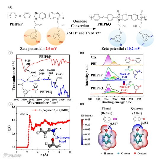 图2酚羟基侧链醌转换前后的化学结构(a)蒽醌转化的反应方程式和ζ电位;(b)FTIR光谱;(c)XPS高分辨率C1s谱图;(d)PBI咪唑中的H原子与醌基中的O原子之间的RDF曲线;(e)苯酚和醌基的核密度分布和氧原子电荷