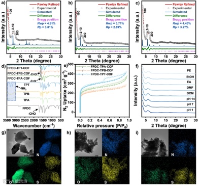 图2. FPDC-TPA-COF、FPDC-TPB-COF和FPDC-TPT-COF的结构表征。FPDC-TPA-COF (a)、FPDC-TPB-COF (b)、FPDC-TPB-COF (c)的PXRD图;(d) FPDC-TPA-COF、FPDC-TPB-COF、FPDC-TPT-COF及其单体的FTIR图;e) FPDC-TPA-COF、FPDC-TPB-COF和FPDC-TPT-COF的N2吸附-脱附等温线;(f)展示FPDC-TPT-COF稳定性的PXRD图;FPDC-TPA-COF (g)、FPDC-TPB-COF (h)和FPDC-TPT-COF (i)的TEM和元素mapping图;比例尺= 200 nm。
