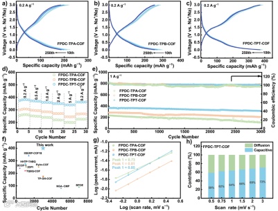 图3. 不同COF基电极钠离子电池的电化学性能。(a-e)在0.2 A g−1电流密度下,循环250次后COF基电极的充放电曲线;(d) COF基电极在不同电流密度下的速率性能,不包括第一个循环数据点;(e)循环稳定性-在电流密度为1 A g−1时的放电容量保持情况(包括第一次放电循环)和库仑效率;(f) FPDC-TPT-COF与之前报道的SIB负极的性能比较;(g)由氧化电流峰值确定的b值;(h)不同扫描速率下FPDC-TPT-COF电极的电容和扩散贡献。