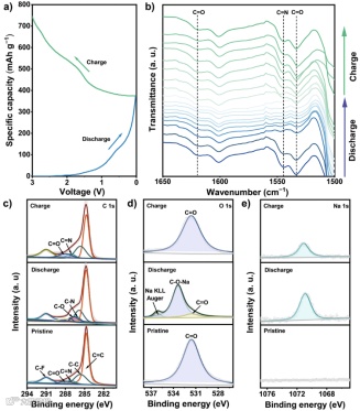 图4. FPDC-TPT-COF电极在储钠/脱钠过程中活性位点的结构演变。a) FPDC-TPT-COF电极在0.2 A g−1电压范围为0.05 ~ 3.0 V时的放电和充电曲线;b) FPDC-TPT-COF电极在不同充放电状态下的原位FTIR光谱,对应于a);c) C1s, d) O1s和e) Na1s XPS光谱。